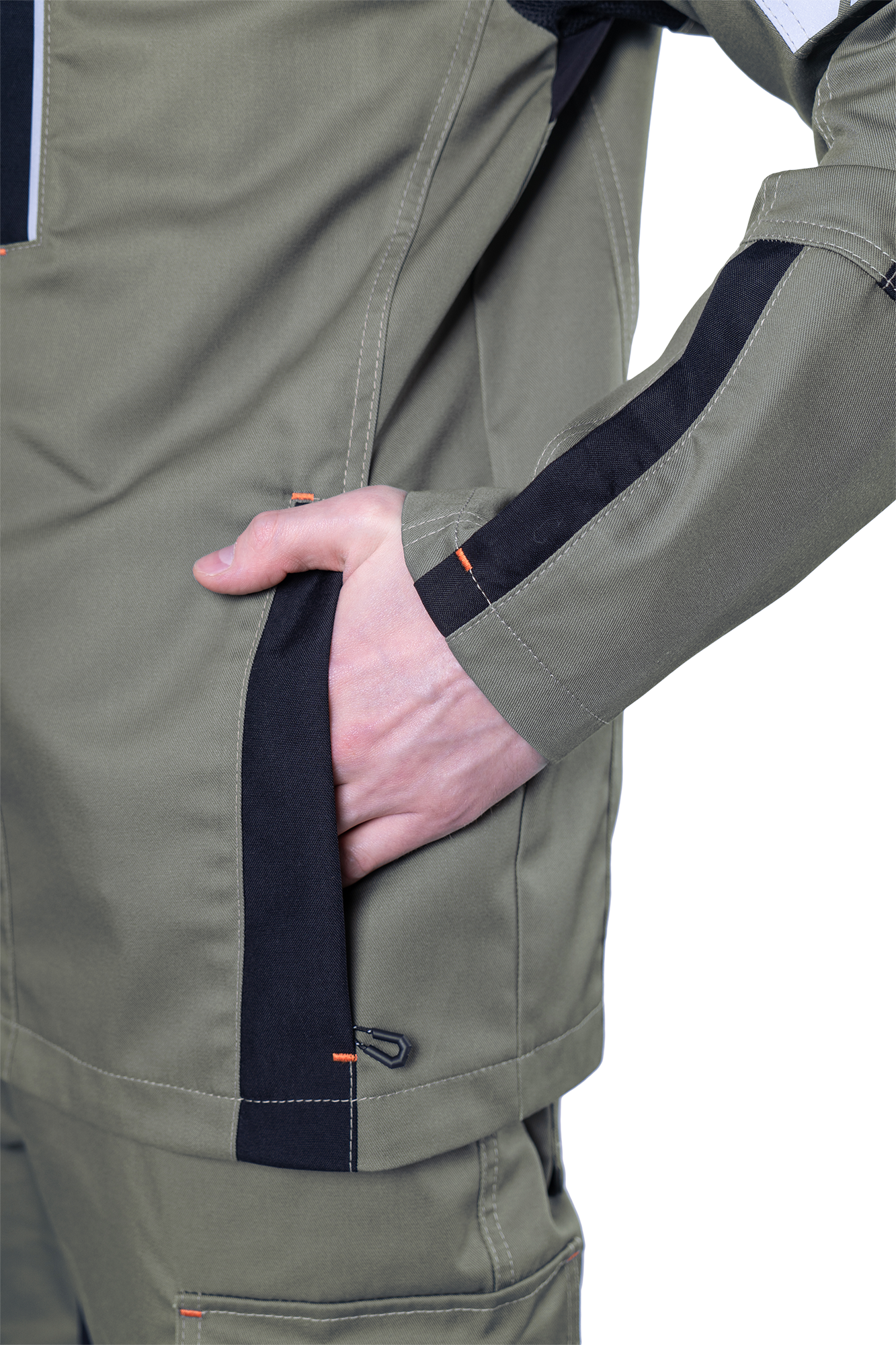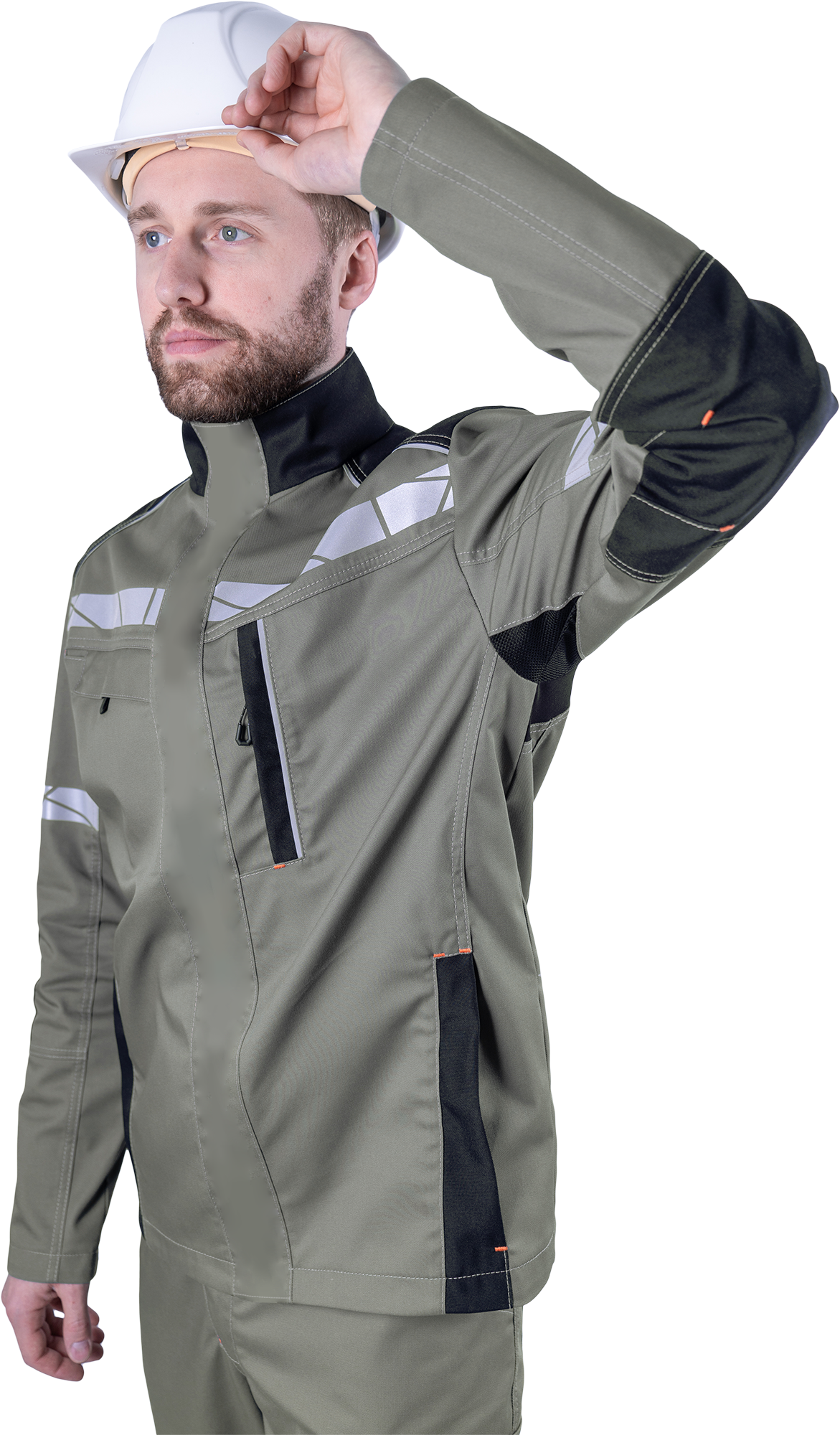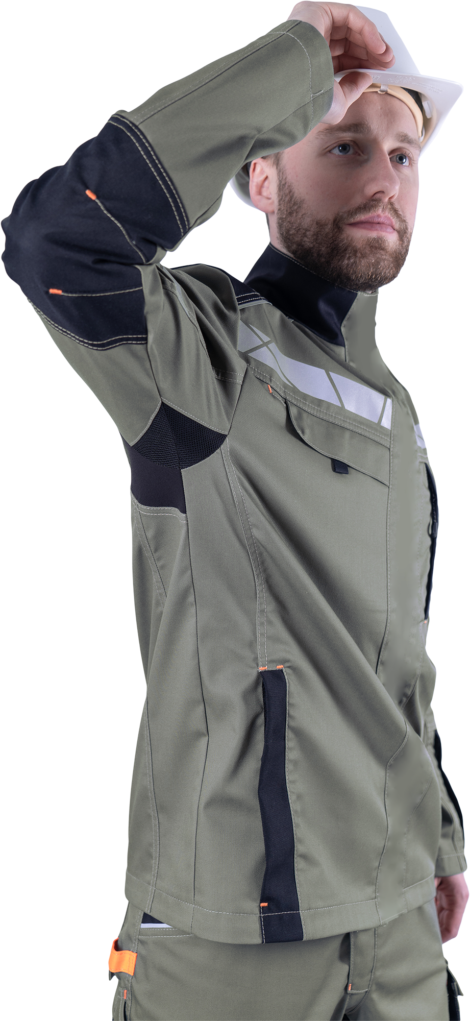 • рукава, соответствующие естественному положению рук при работе, налокотники с вытачками из износостойкой ткани (100% полиамид 6.6)
