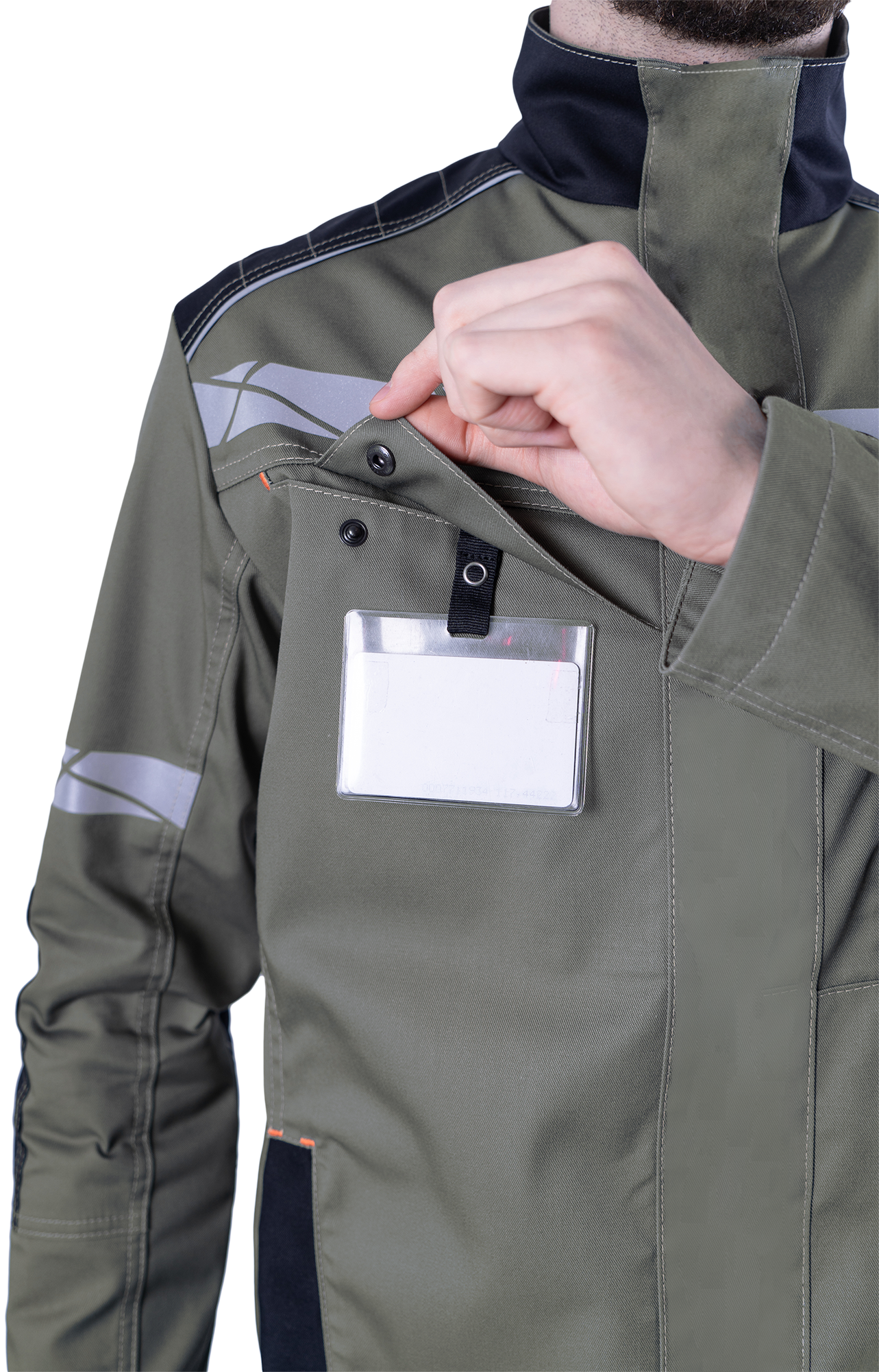 • на правой полочке карман в шве кокетки с клапаном, с тесьмой на кнопке для крепления бейджа