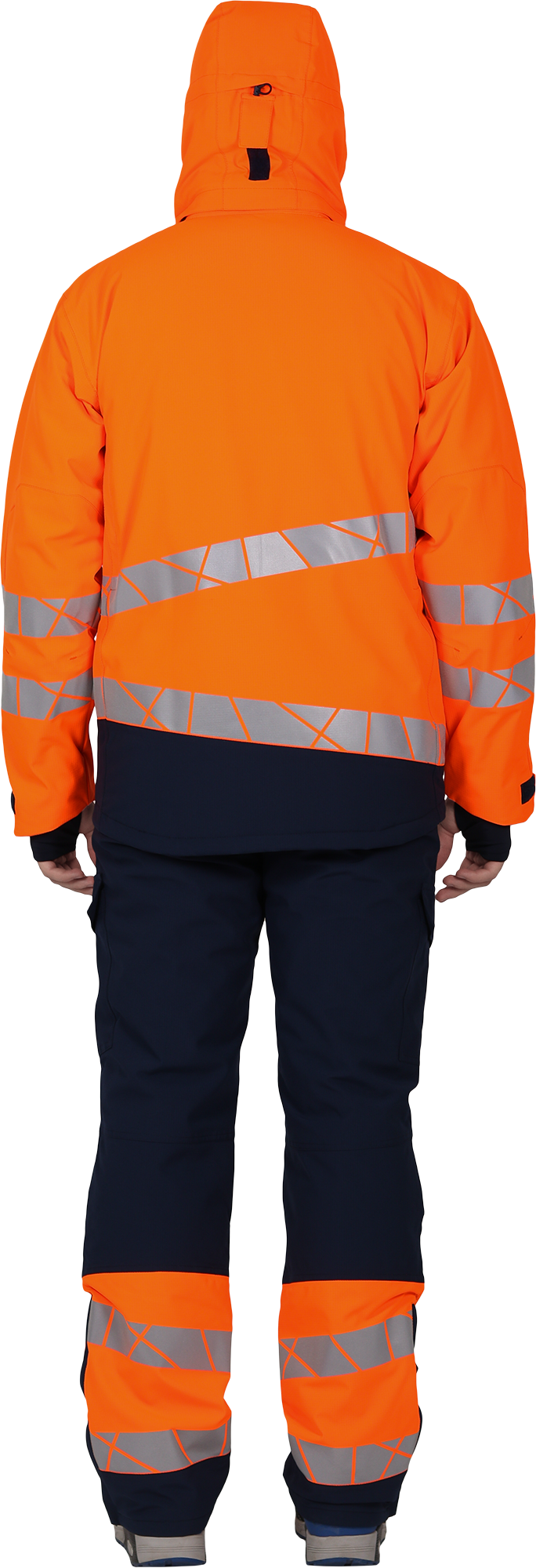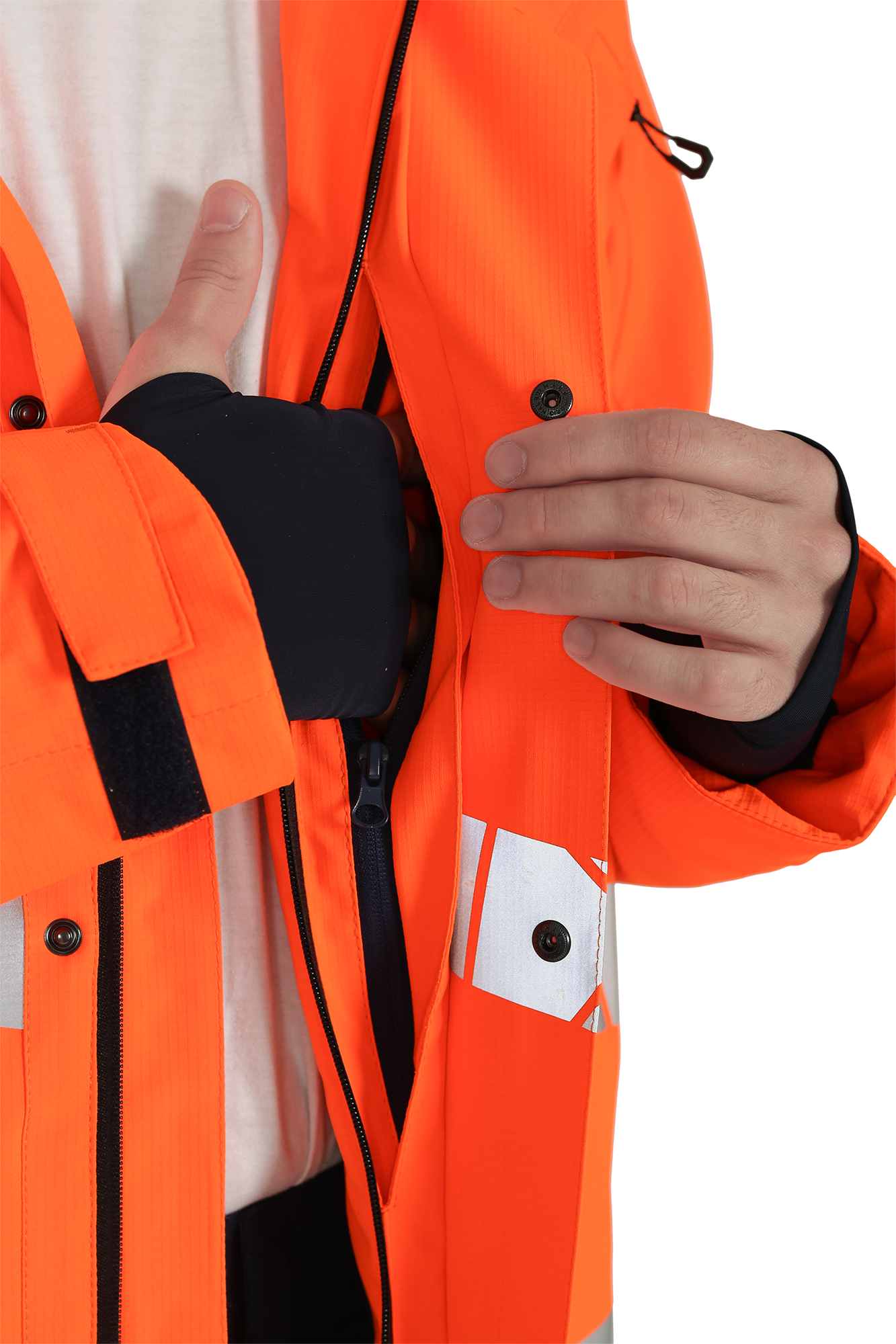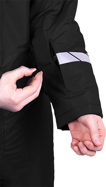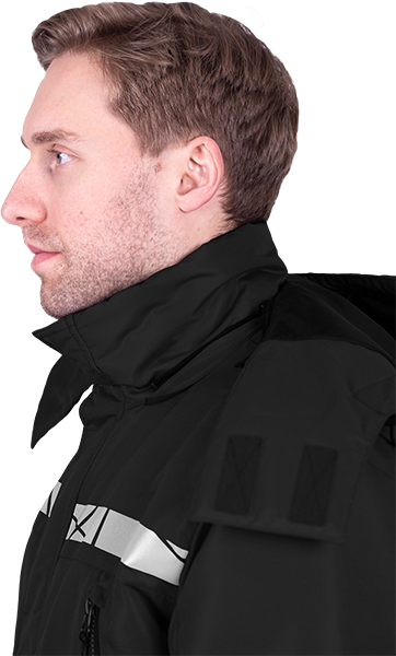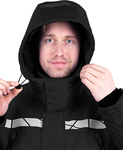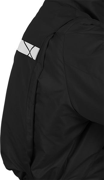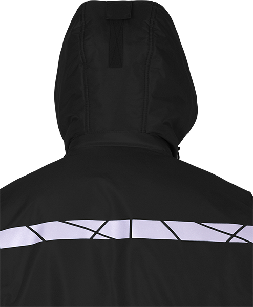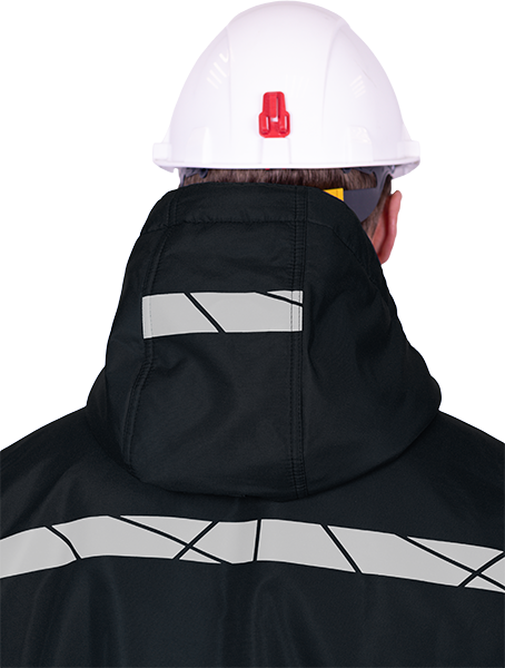 • две охватывающие термолкеевые световозвращающие полосы шириной 50 мм по торсу куртки и рукавам