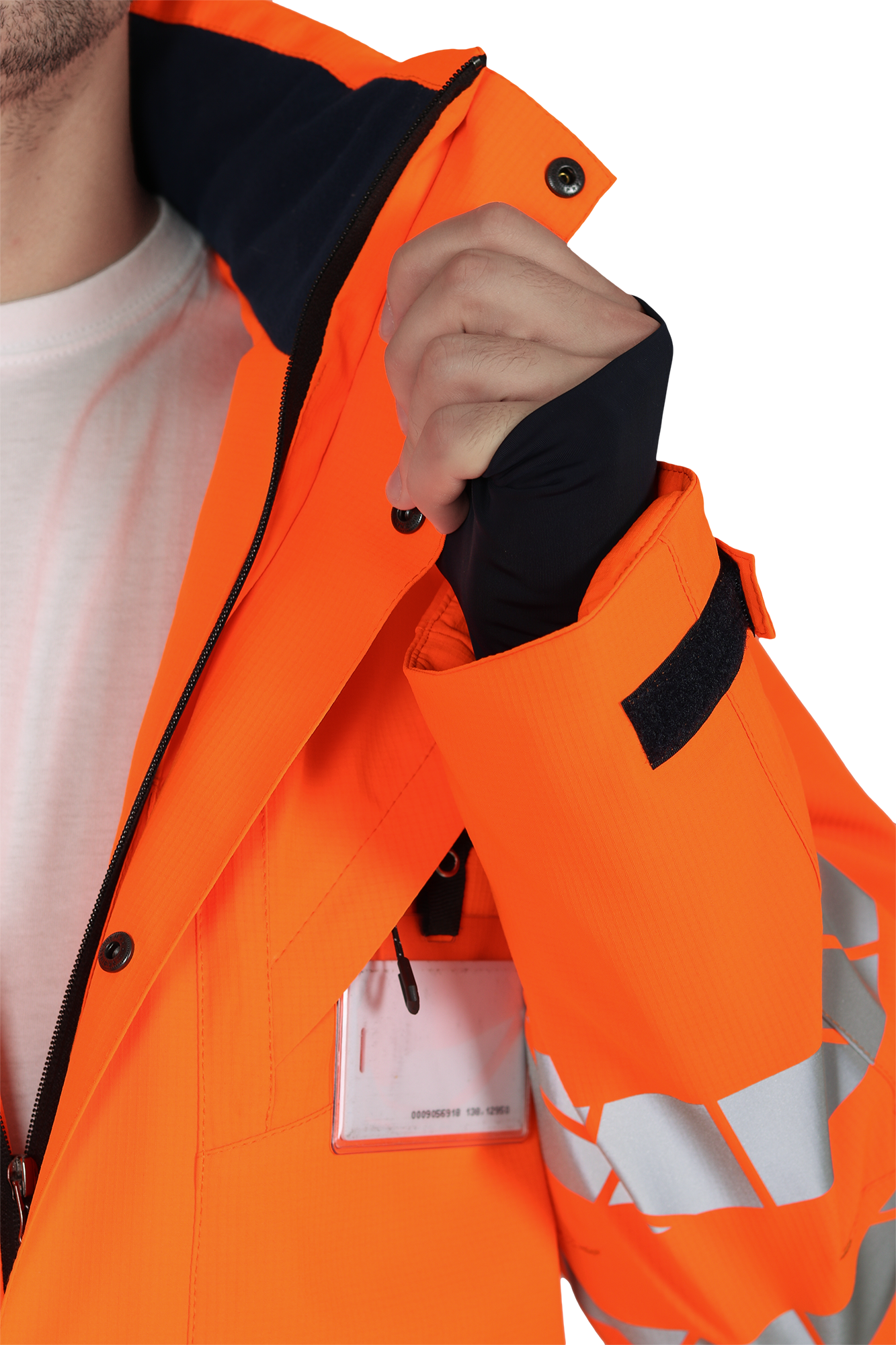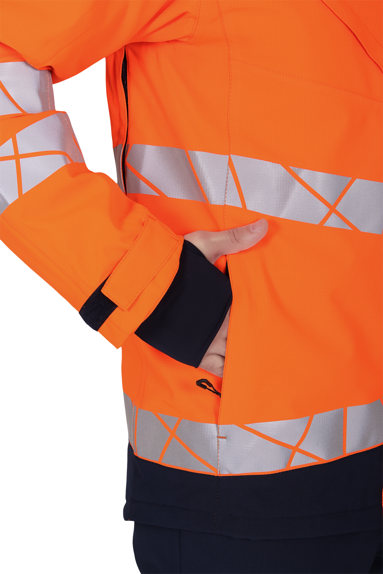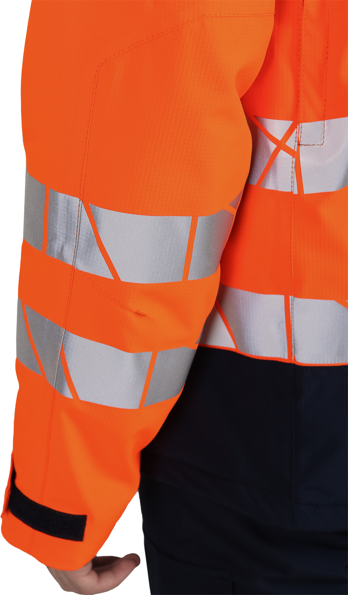 • две охватывающие термолкеевые световозвращающие полосы шириной 50 мм по торсу куртки и рукавам