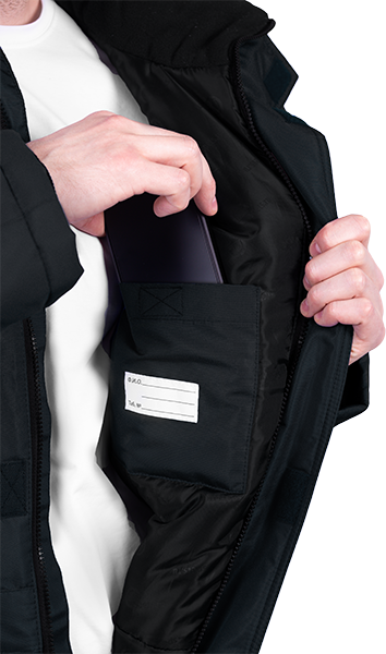 • между бортом и ветрозащитной планкой — внутренний карман на молнии под документы формата А4