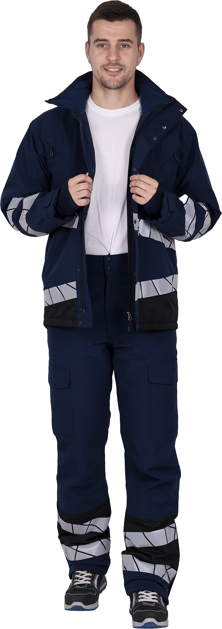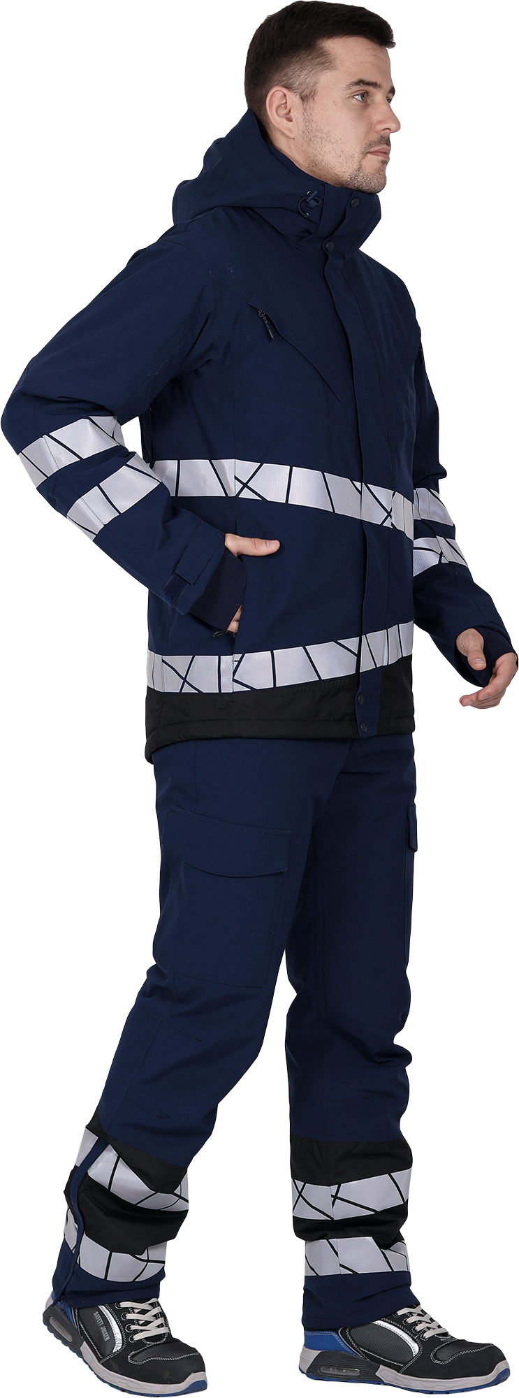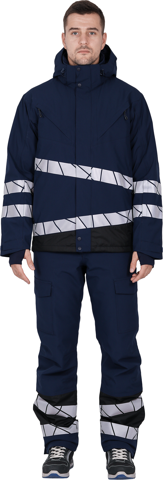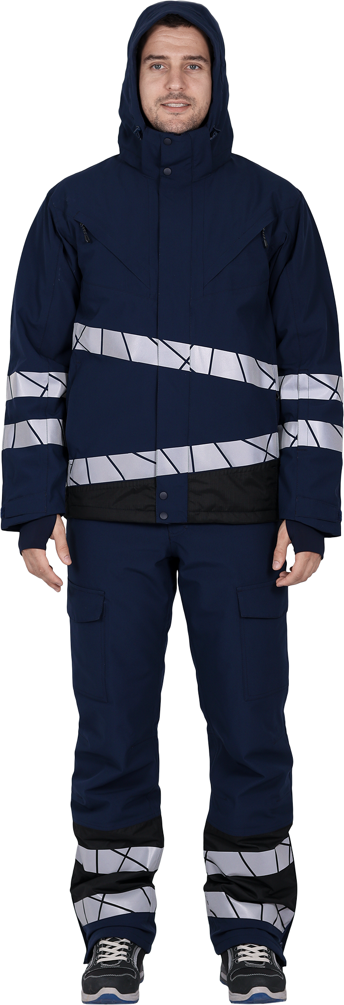 • две охватывающие термолкеевые световозвращающие полосы шириной 50 мм по торсу куртки и рукавам
