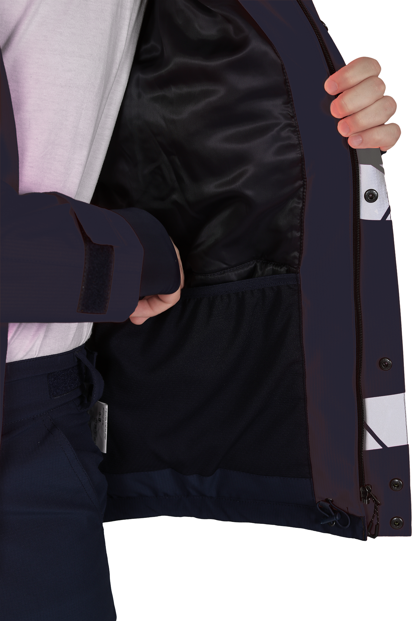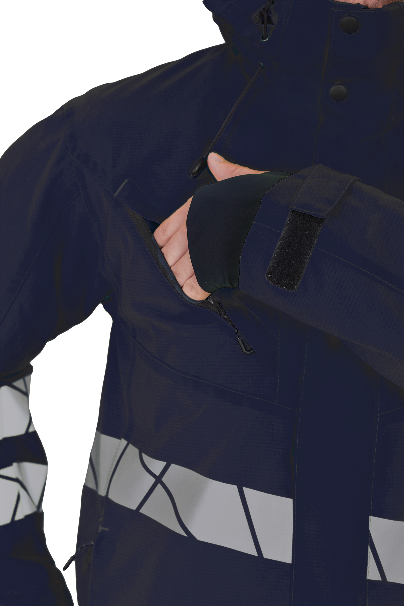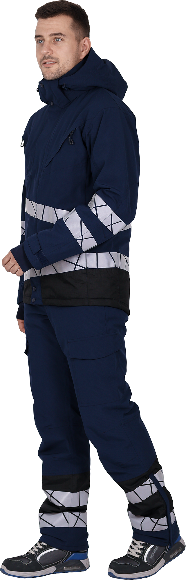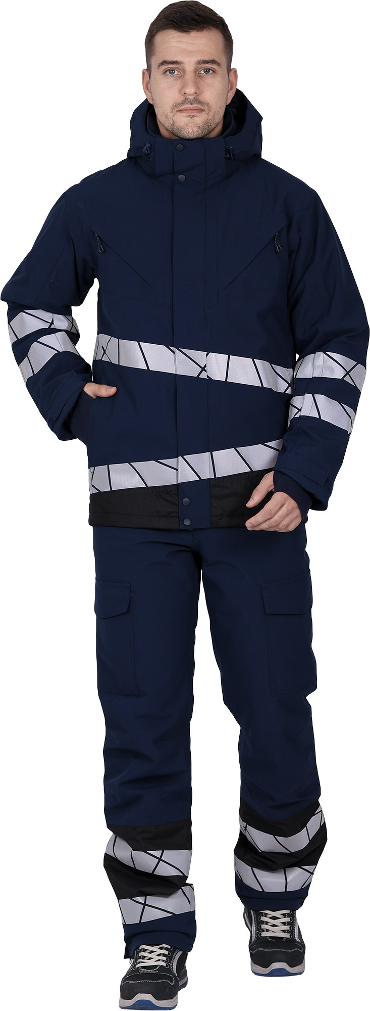 • две охватывающие термолкеевые световозвращающие полосы шириной 50 мм по торсу куртки и рукавам