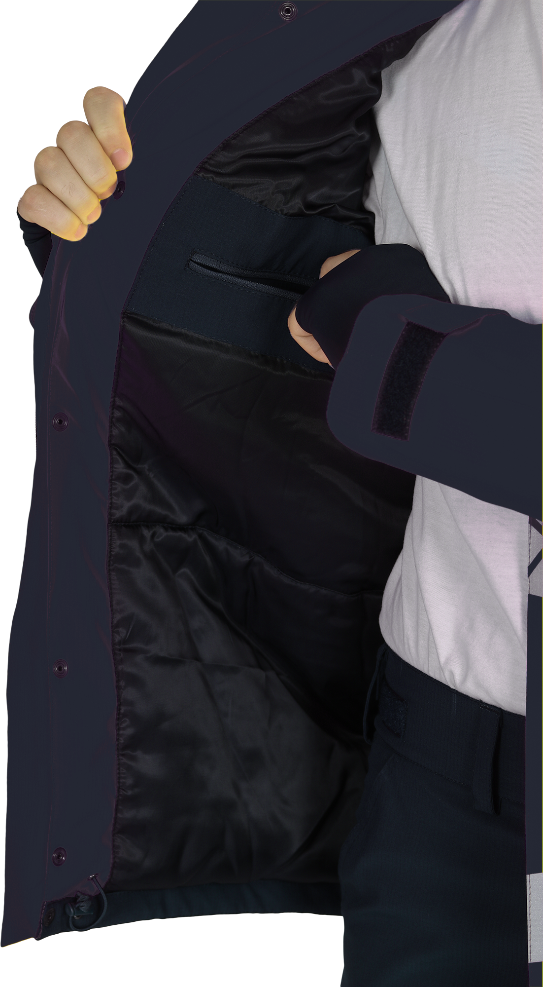 • между бортом и ветрозащитной планкой — внутренний карман на молнии под документы формата А4