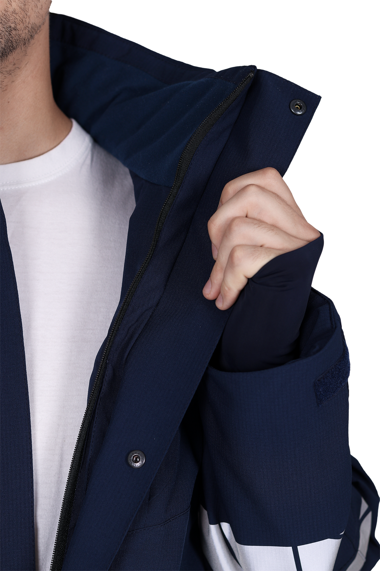 • в низу рукава трикотажная манжета с разрезом для большого пальца, ширина рукавов внизу регулируется патой