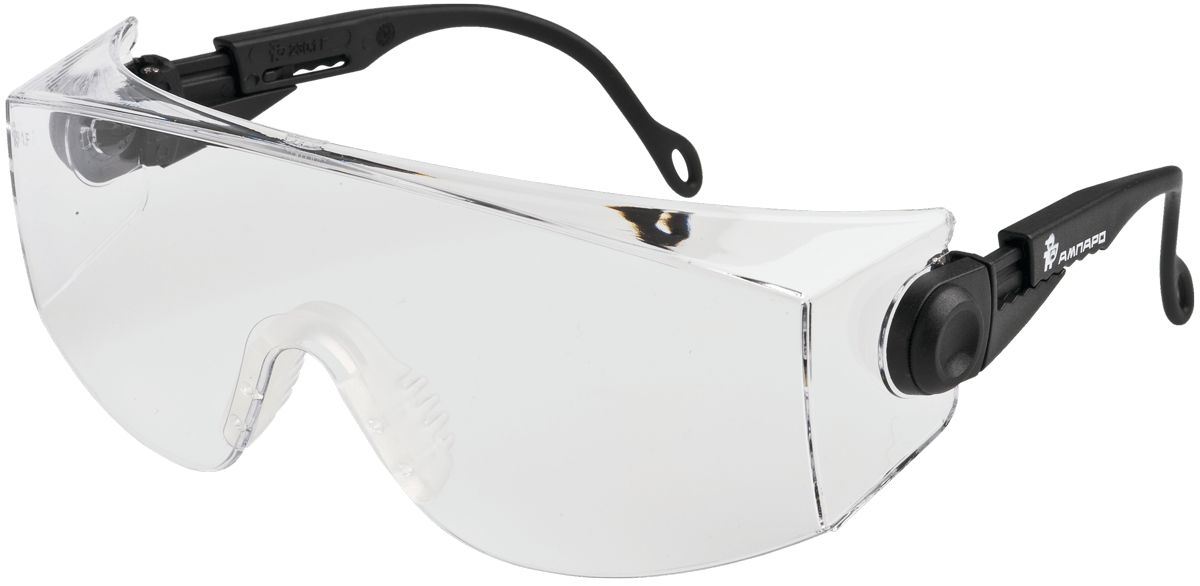 Универсальные очки с увеличенным панорамным обзором для защиты от высокоскоростных летящих частиц с низким уровнем кинетической энергии и УФ-излучения.