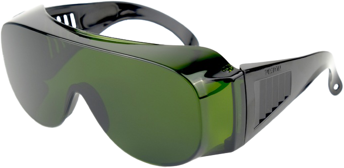 Универсальные очки с панорамным защитным стеклом-светофильтром увеличенного размера из поликарбоната тёмно-зеленого цвета с твердым покрытием на наружной стороне и с незапотевающим покрытием на внутренней, обращенной к глазу, стороне.