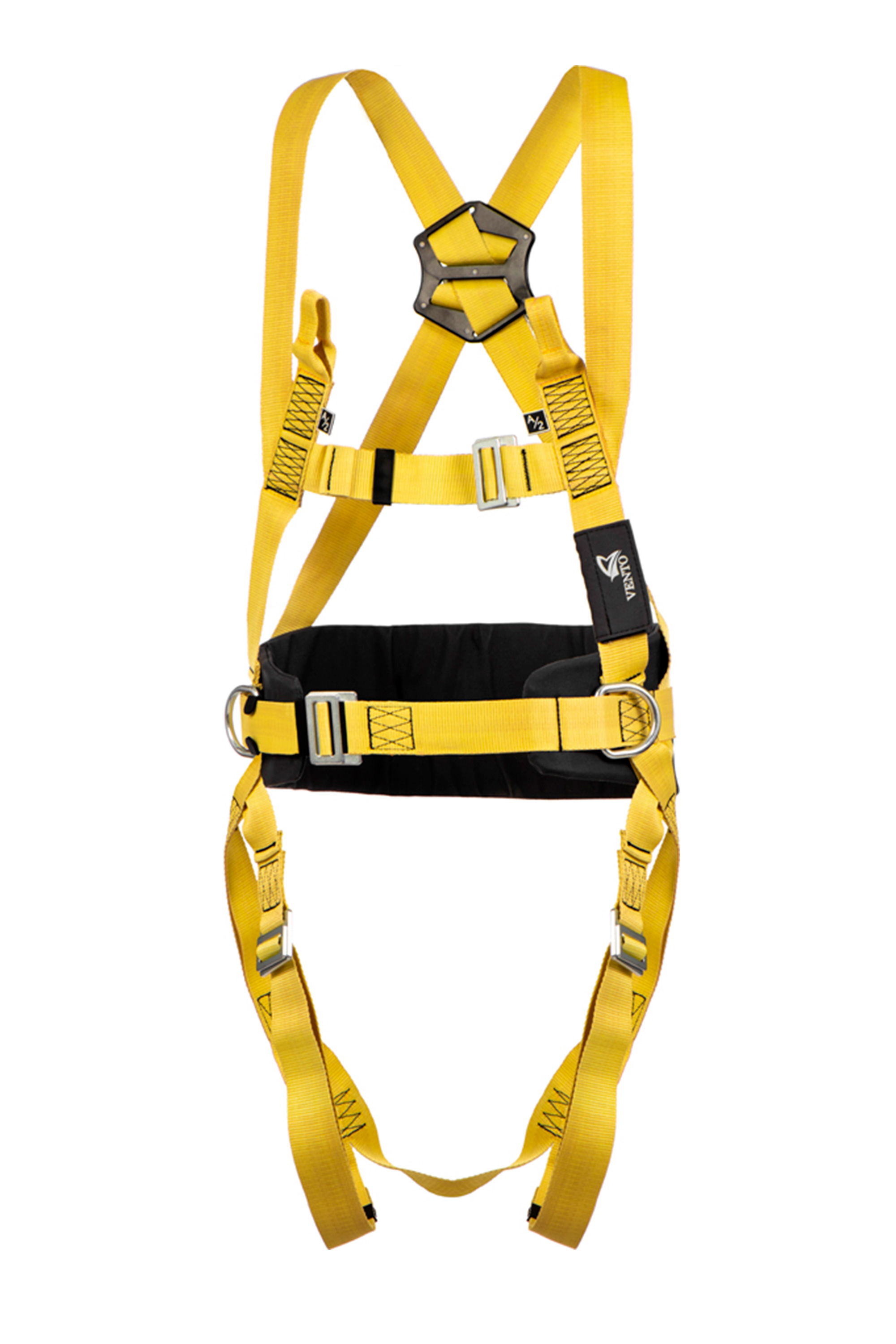 Страховочная точка, расположенная на спине, передвигается под рост пользователя. Ее можно смещать по вертикали на Х-образных плечевых лямках для корректировки правильного положения.