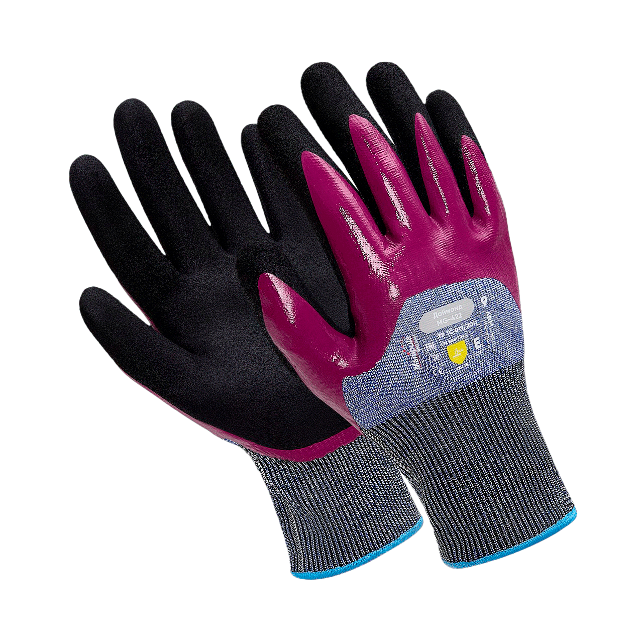 Покрытие 3/4 из комбинированного гладкого и микрогранулированного (песчаного) нитрила — надежный захват предметов в агрессивных средах (Нс, Нм); высокий уровень защиты от истирания