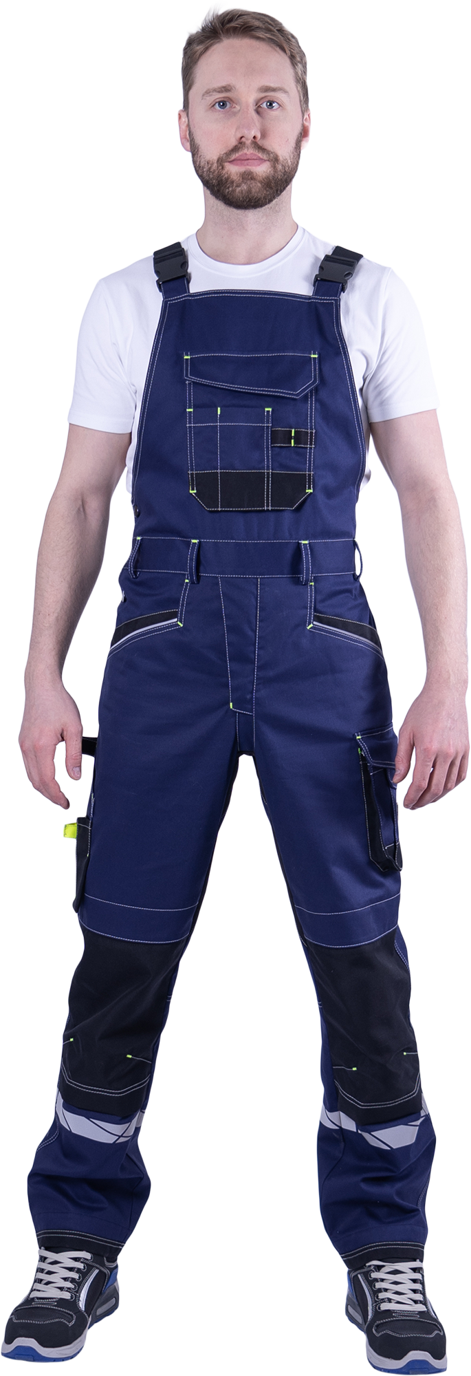 • с отрезным нагрудником, с вместительным накладным карманом с клапаном на ленте-контакт