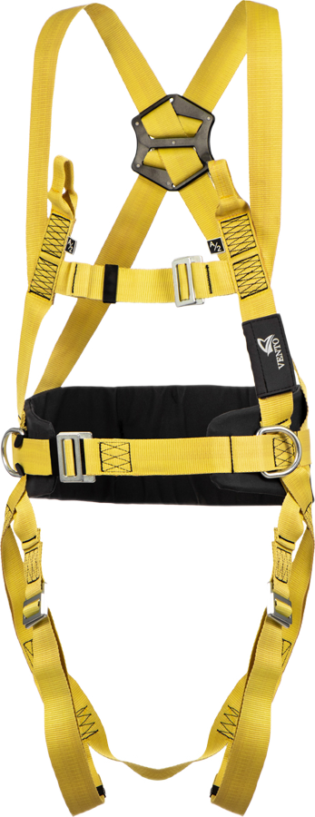 Страховочная точка, расположенная на спине, передвигается под рост пользователя. Ее можно смещать по вертикали на Х-образных плечевых лямках для корректировки правильного положения.