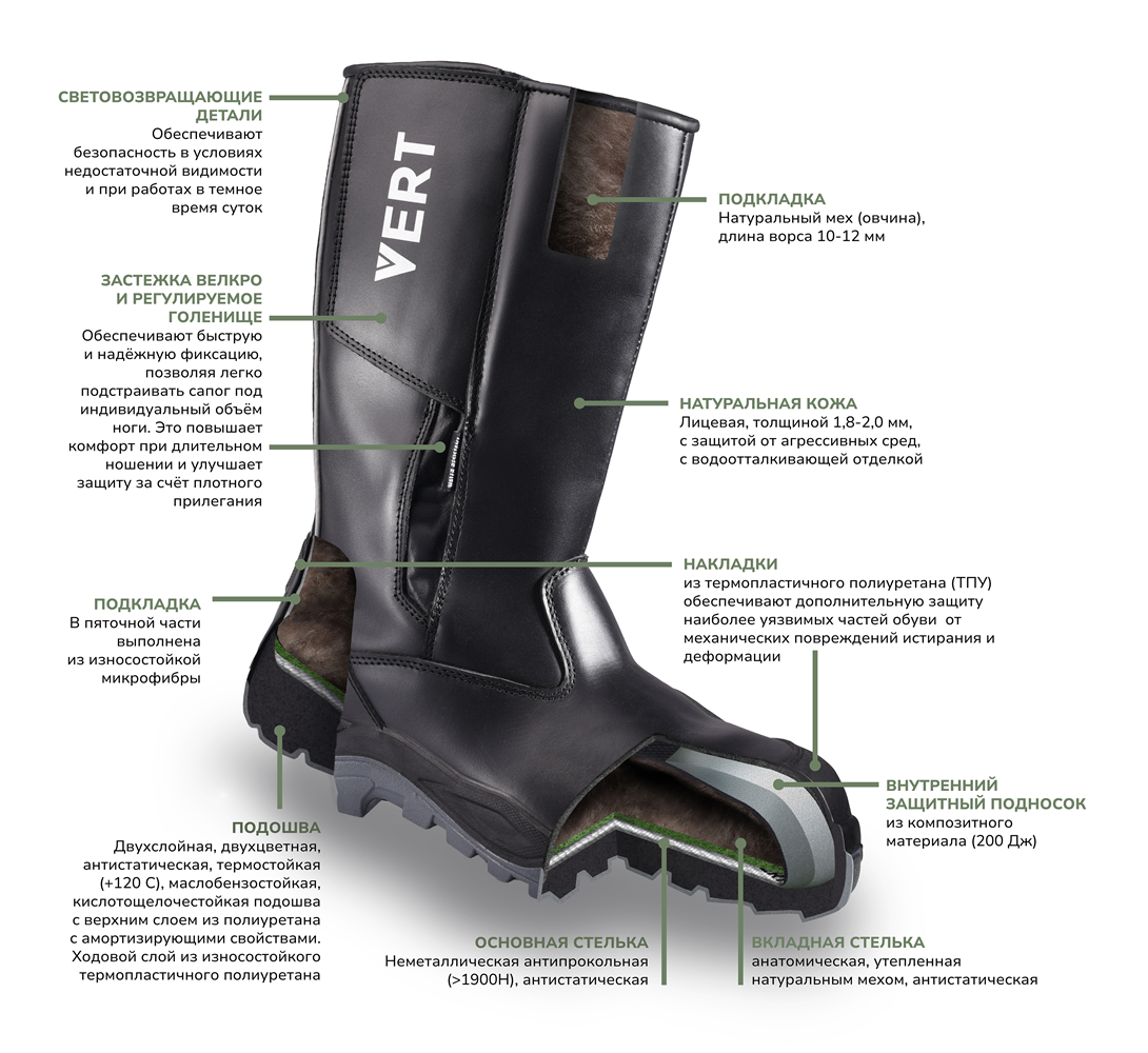 Сфера применения (назначение): защита ног при выполнении технологических операций с технологическим оборудованием и инструментом в зимний период времени. Снижение риска искрообразования. Для прохождения через металлодетекторы. Рекомендуется для нефтегазовой, химической, металлургической отраслей, а также в машиностроении, логистике, производстве, строительстве, автосервисе и других сфер, где важны максимальная защита, легкость и комфорт.