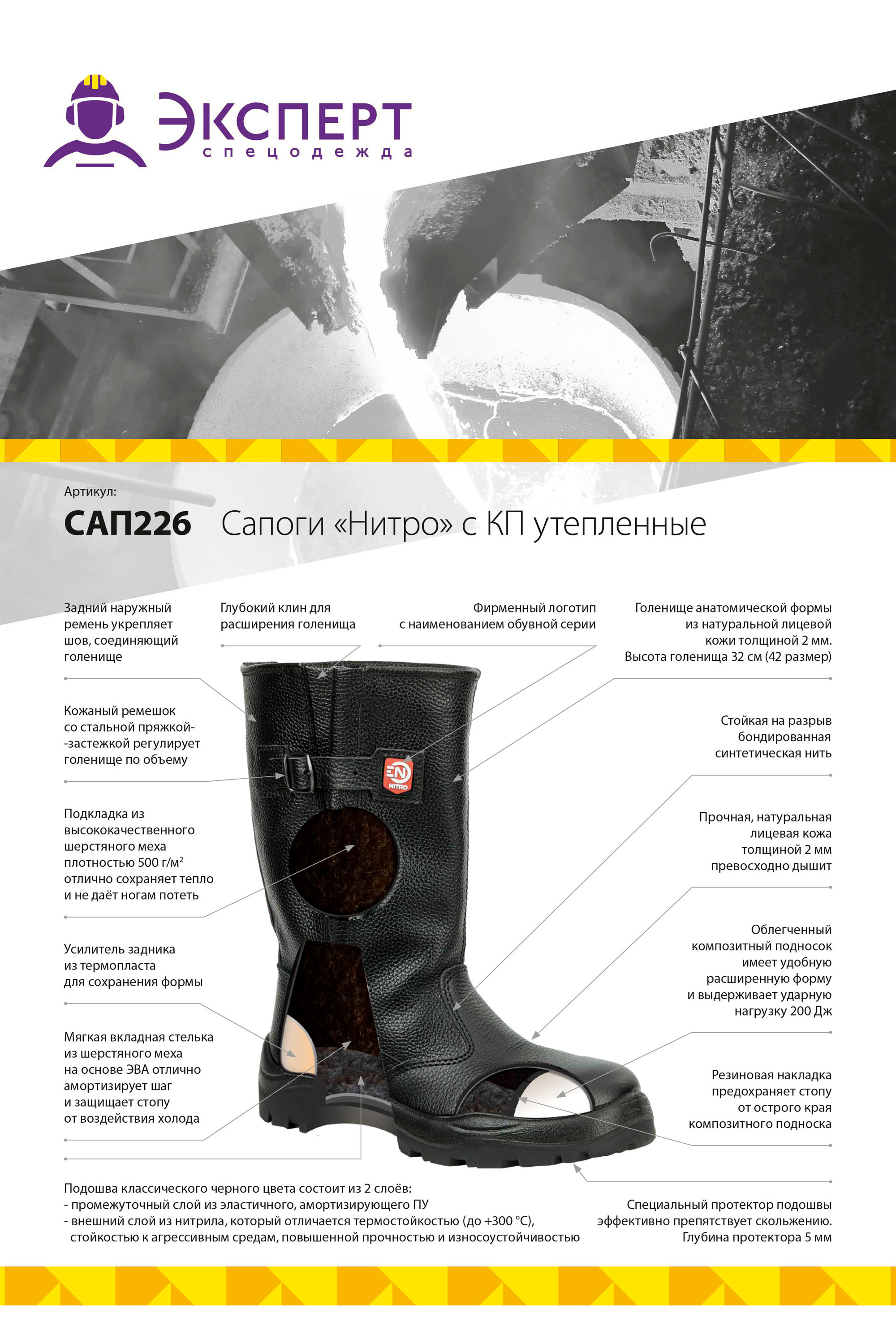 ■ Подошва: ПУ-Нитрил, двухслойная, внутренний слой из облегченного и амортизирующего полиуретана, ходовой слой из нитрильной резины, обладает повышенной прочностью, защищает от кратковременного контакта с нагретыми поверхностями (до +300), и обеспечивает защиту от агрессивных сред (МБС, КЩС), имеет специальный протектор, эффективно препятствующий скольжению, глубина протектора составляет 4,5-5,0 мм.