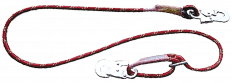 Строп из полиамидного каната с регулятором длины и двумя малыми карабинами-крюками, соединяя анкерное устройство с привязью, надетой на работника, обеспечивает безопасность при работах на высоте, предотвращая падение с высоты.