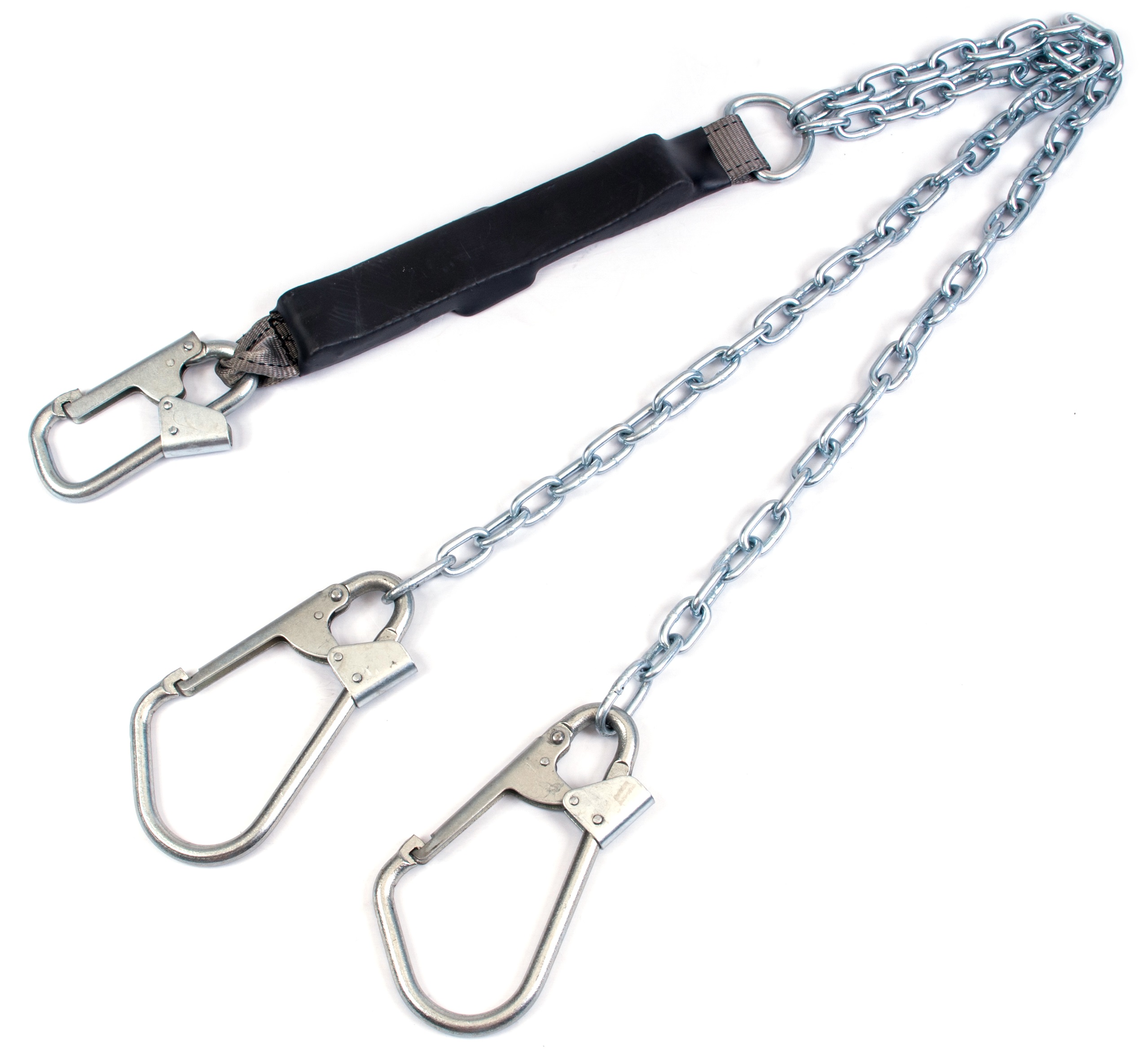 Строп из металлической цепи ф6 мм двухветьевой комбинации с амортизаторои и тремя карабинами используется как средство индивидуальной защиты от падения с высоты, может применяться как отдельная соединительная деталь, узел или компонент в системе с привязями и с анкерной точкой.